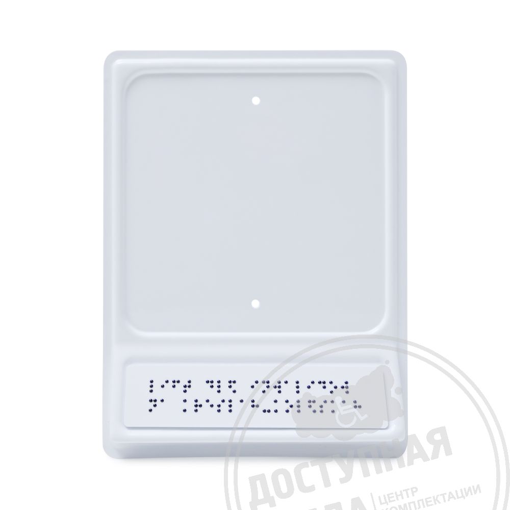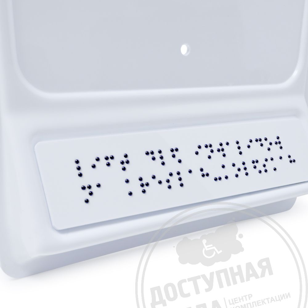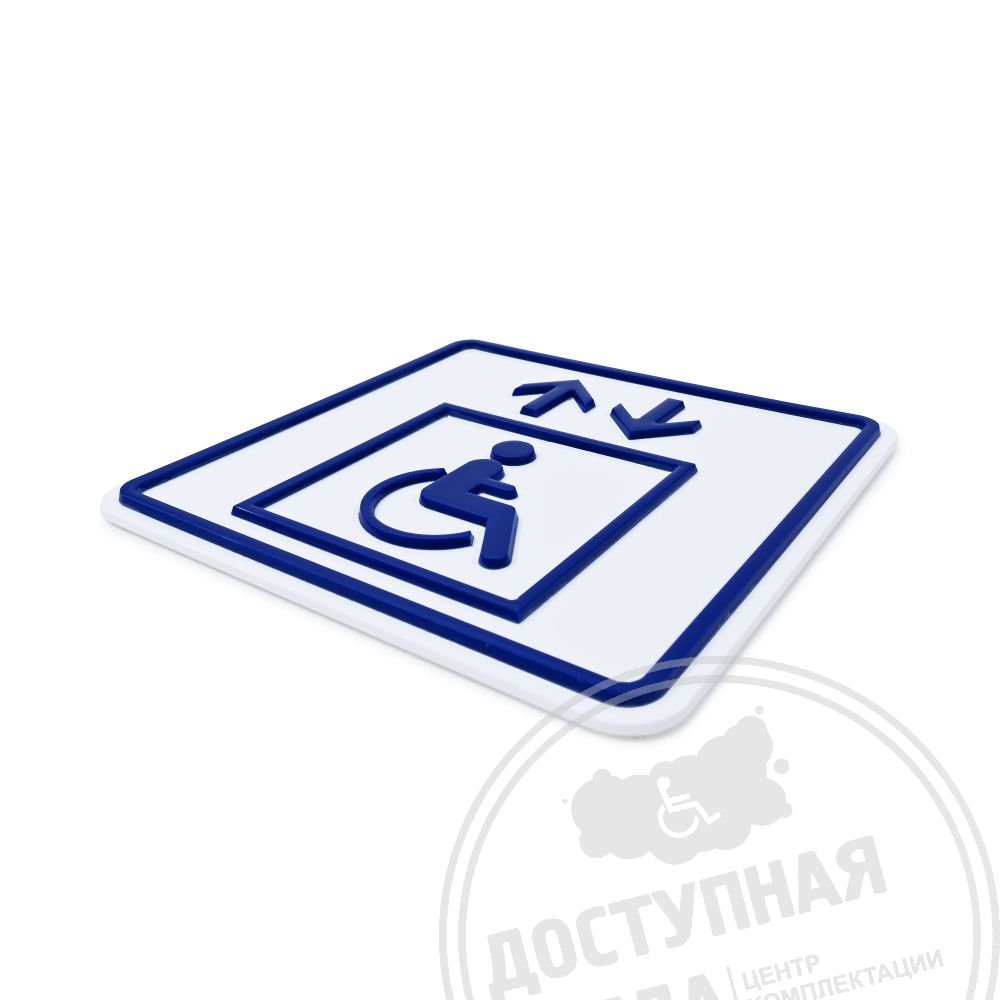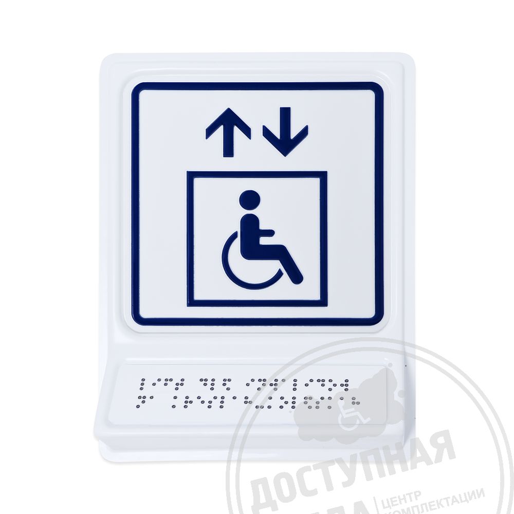 Тактильный указатель обозначающий лифт для инвалидов на креслах-колясках. Обладает тактильным эффектом для восприятия незрячими и слабовидящими людьми. Информация продублирована по системе Брайля на специальной наклонной площадке, что позволяет считывать информацию незрячему человеку значительно быстрее.