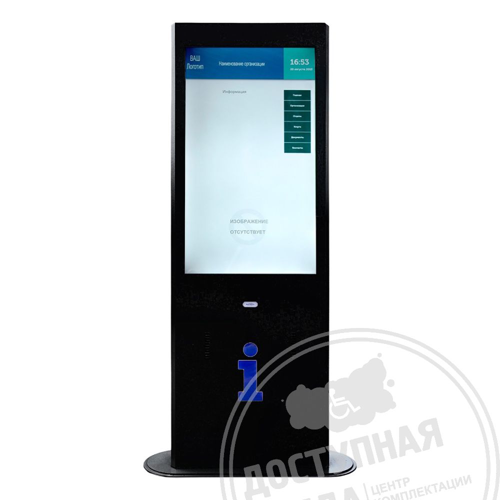 Терминал "INFO-VERT-1(43)V" специально разработан для использования его в качестве информационного устройства лицам с ограничениями по здоровью (слабовидящих, в коляске). Информационный терминал имеет антивандальный стальной корпус с контурной подсветкой, вертикальную сенсорную LED-панель размером 43 дюйма, а также предустановленное программное обеспечение с функцией чтения с экрана и адаптивным меню для пользователей с ограниченными возможностями. Дополнительные функции могут быть установлены для людей со слабым слухом.