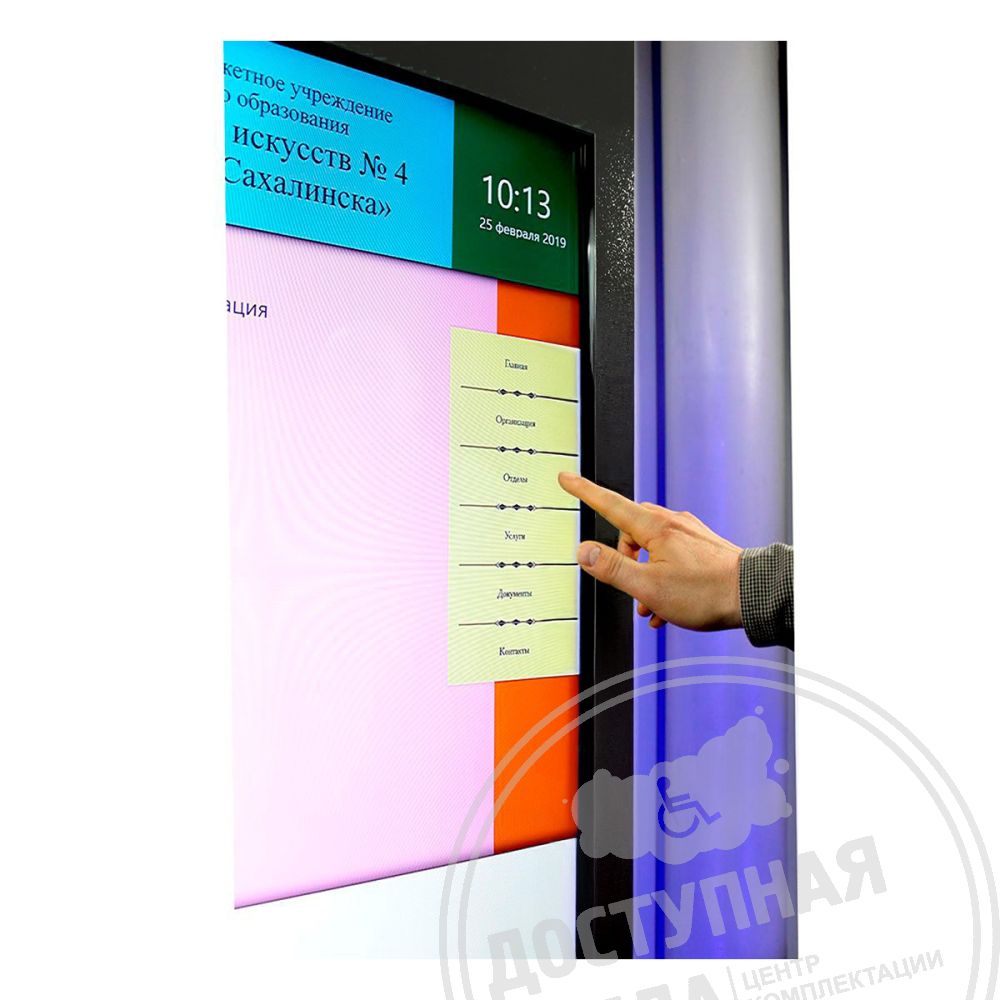 Сенсорный информационный терминал специально разработан для использования его в качестве информационного устройства лицам с ограничениями по здоровью (слабовидящих, в коляске).
