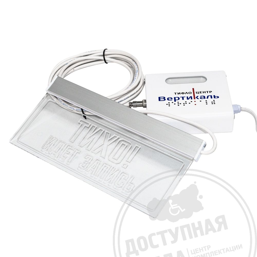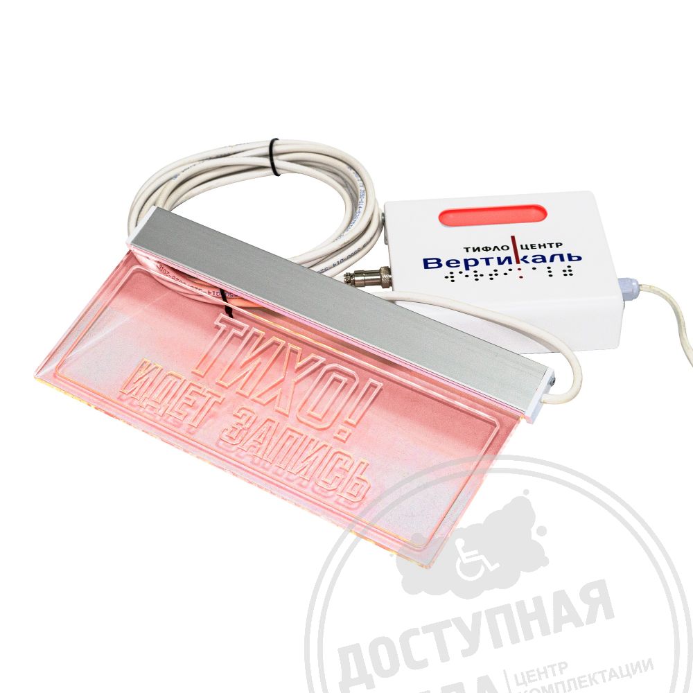 Изделие представляет собой систему оповещения, состоящую из блока активации и визуально-информационного табло с надписью «ТИХО! ИДЕТ ЗАПИСЬ». Табло устанавливается перед входом в кабинет, блок активации — внутри. Устройства соединяются кабелем ПВС 3х0,5 длиной 5 м (в комплекте) и питаются от сети 220 В. Подсветка табло включается красным светом по сигналу с пульта (кнопка «А») и отключается кнопкой «В». Цвет подсветки дублируется в окошке блока активации для удобства контроля. Красное свечение означает запрет входа, отсутствие — разрешение. Блок оснащён выключателем питания для обоих устройств.