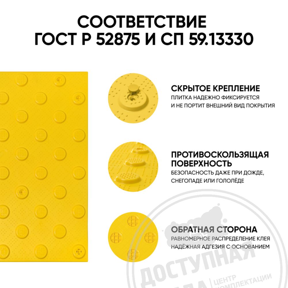 Тактильная полиуретановая плитка соответствует требованиям ГОСТ Р 52875-2018 и изготавливается из прочного полиуретана с твёрдостью не более 85 ед. по Шору (шкала А). Материал отличается устойчивостью к перепадам температур, влагостойкостью и частичными грязеотталкивающими свойствами, что делает плитку подходящей как для внутренней, так и для наружной укладки. Дополнительно поверхность имеет противоскользящее покрытие, обеспечивающее безопасное использование на различных типах оснований.