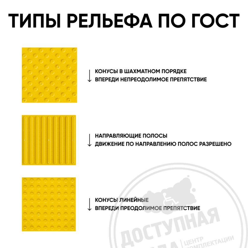 Поверхность ТНУ должна обладать противоскользящими свойствами, сохраняющимися при движении в любых направлениях, иметь определенный тип рифления. Размеры, тип рифления, цвет, назначение, правила применения и технологии обустройства (размещения и закрепления) ТНУ должны соответствовать требованиям настоящего стандарта.