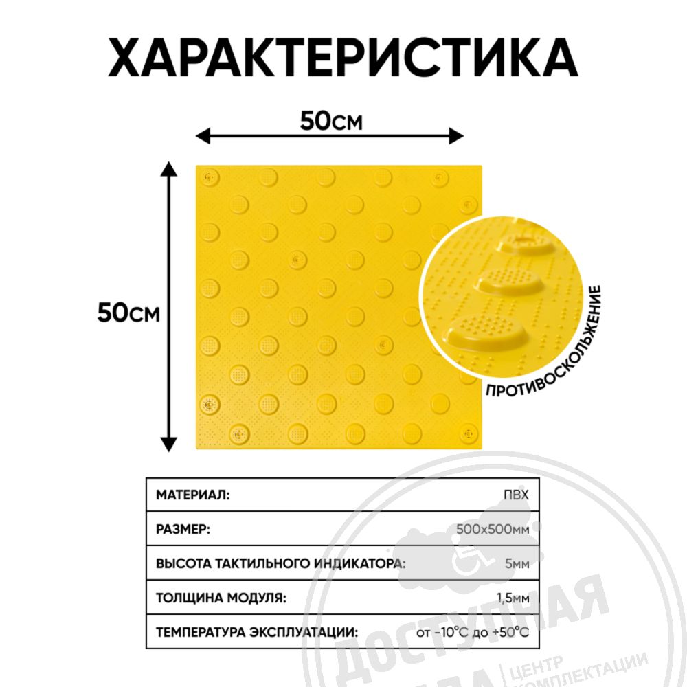 Тактильная плитка соответствует требованиям ГОСТ Р 52875-2018 и изготавливается из литого ПВХ с твёрдостью по Шору не более 98 ед. по шкале А. Материал обладает высокой прочностью, устойчивостью к влаге и износу, что предотвращает образование заломов при монтаже и обеспечивает длительный срок службы. Дополнительно плитка снабжена противоскользящей поверхностью с литым микрорельефом, обеспечивающим безопасность использования в помещениях.