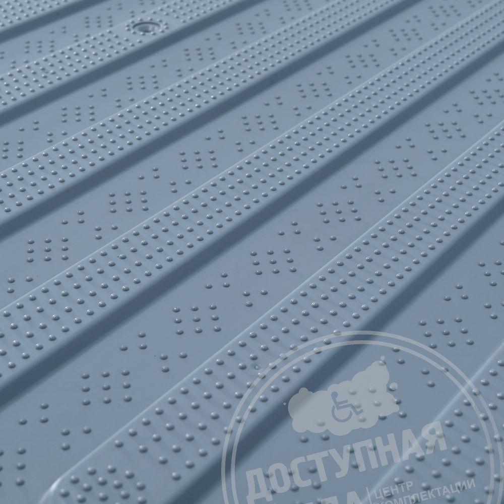 Тактильные рифы, выполненные в форме параллельных полос, помогают людям с нарушениями зрения ориентироваться и безопасно двигаться вперёд без препятствий на пути. Поверхность оснащена противоскользящим литым микрорельефом, что повышает безопасность в эксплуатации внутри помещений.