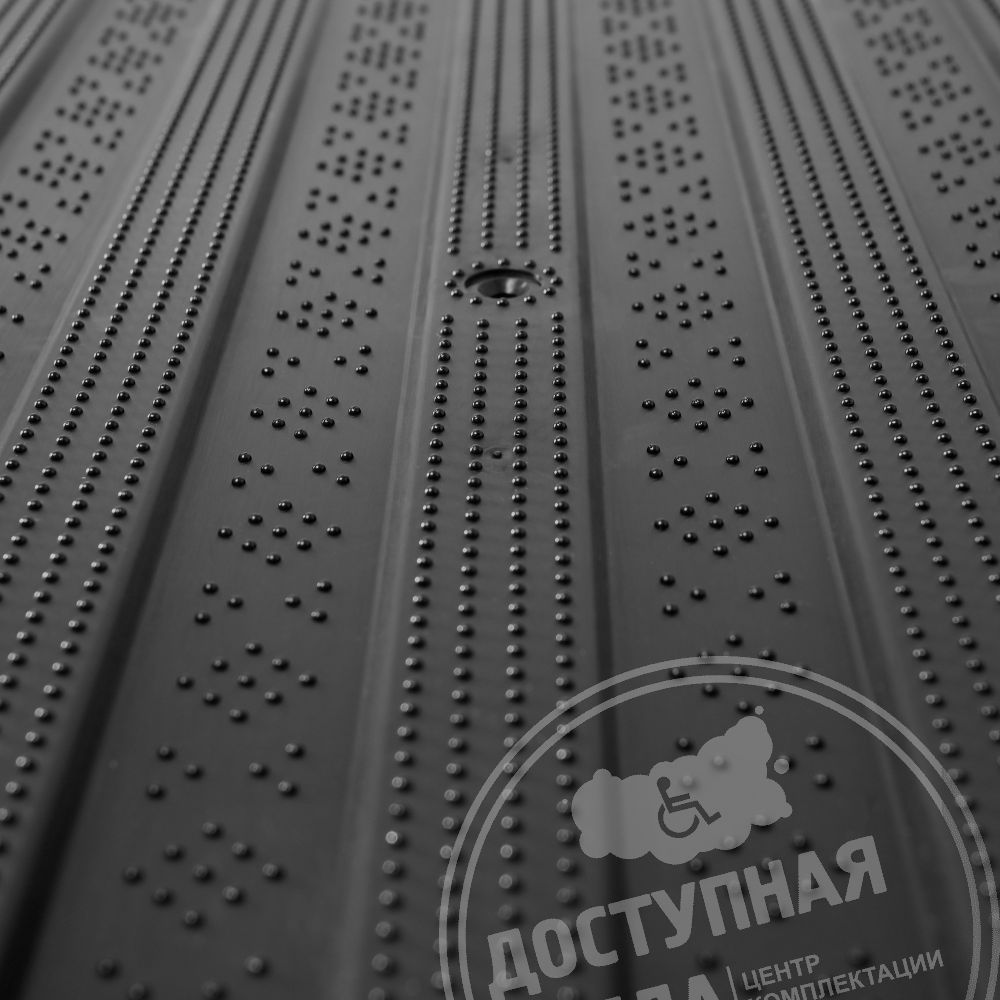Тактильные рифы в виде параллельных полос помогают людям с нарушением зрения ориентироваться и безопасно двигаться вперёд. Поверхность изделия оснащена противоскользящим литым микрорельефом, что повышает уровень безопасности при использовании внутри помещений.