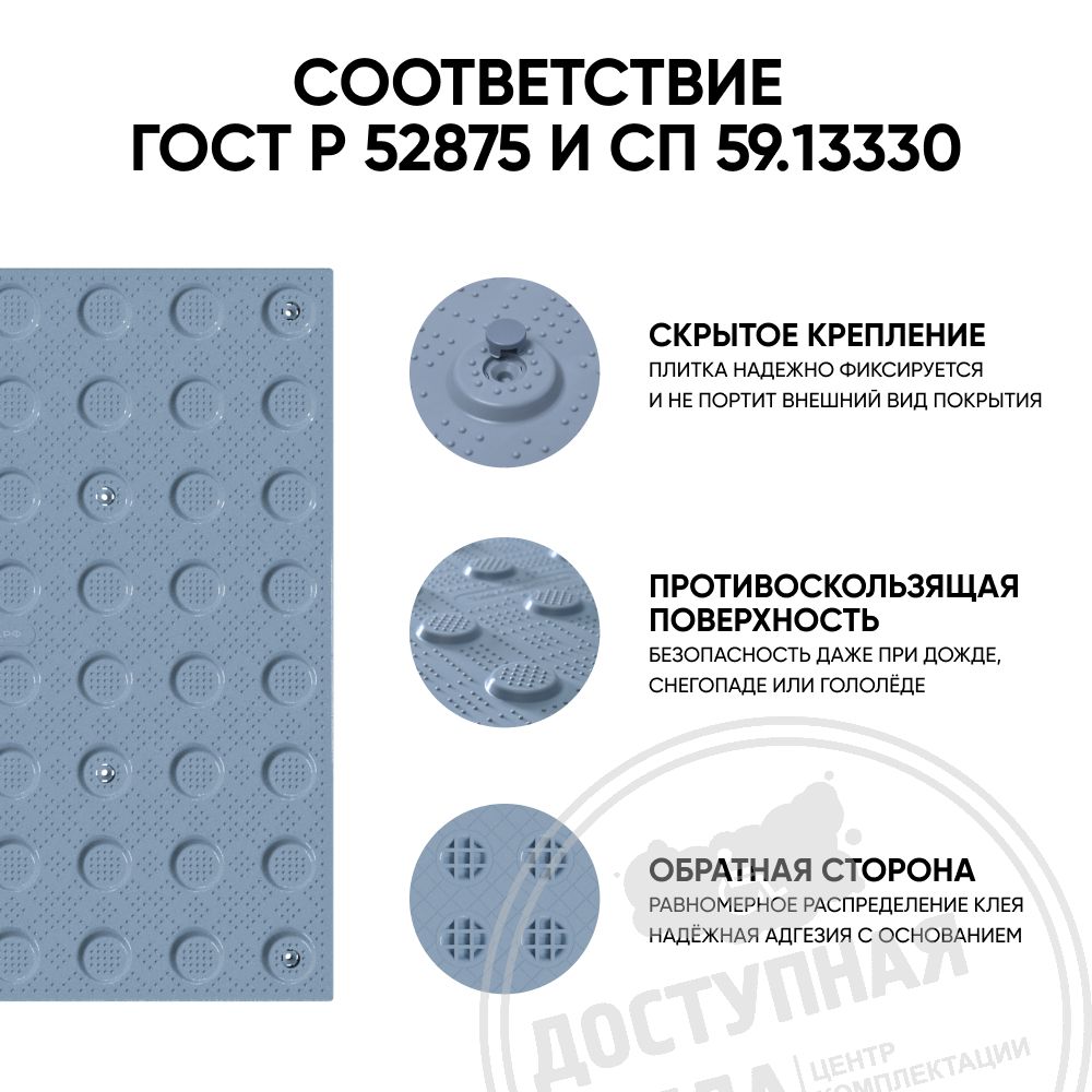 Тактильная полиуретановая плитка соответствует ГОСТ Р 52875-2018. Она изготовлена из прочного полиуретана с твердостью не более 85 ед. по Шору (таблица А). Материал отличается устойчивостью к перепадам температур и обладает частично грязеотталкивающими свойствами. Благодаря этим характеристикам плитка подходит для укладки как в помещениях, так и на улице. Поверхность дополнительно оснащена противоскользящим литым микрорельефом, что обеспечивает безопасность эксплуатации на различных видах оснований.