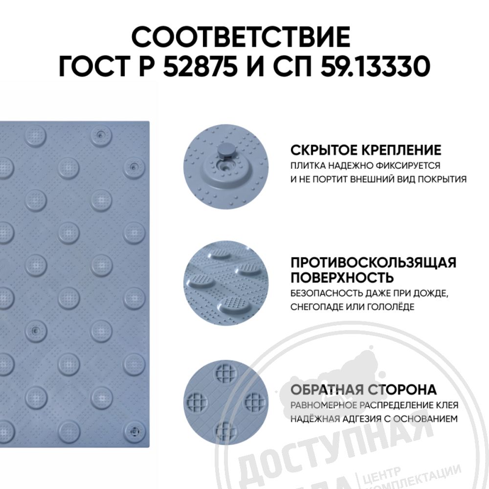 Тактильная полиуретановая плитка соответствует требованиям ГОСТ Р 52875-2018 и изготавливается из полиуретана твёрдостью не более 85 ед. по Шору (шкала А). Материал отличается прочностью, устойчивостью к перепадам температур, влагостойкостью и частичными грязеотталкивающими свойствами, благодаря чему плитка может использоваться как внутри помещений, так и снаружи. Дополнительно поверхность выполнена с противоскользящим покрытием, что обеспечивает безопасность применения на любых типах оснований.