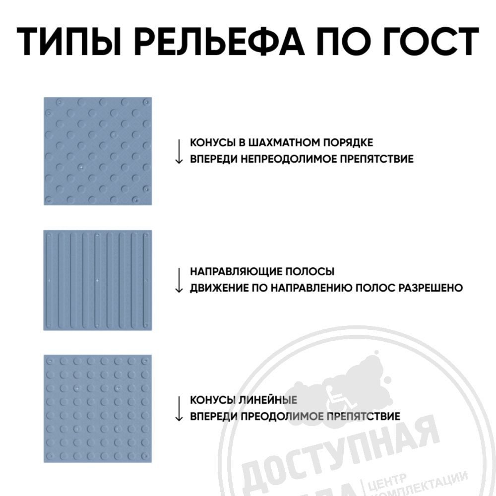 Тактильная плитка соответствует требованиям ГОСТ Р 52875-2018 и изготавливается из литого ПВХ с твёрдостью по Шору не более 98 ед. по шкале А. Такой материал обладает высокой прочностью, устойчивостью к влаге и износу, что предотвращает образование заломов во время укладки и обеспечивает длительный срок службы. Дополнительно плитка оснащена противоскользящей поверхностью с литым микрорельефом, что делает её безопасной для использования в помещениях.