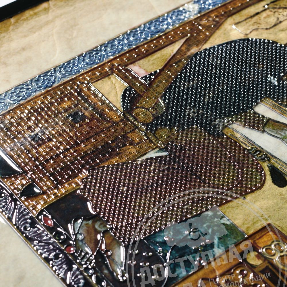 Тактильная поверхность представляет собой рельеф, состоящий из набора полимерных слоёв, где каждый последующий слой полимеризуется на поверхности предыдущего при помощи УФ излучения. Высота рельефно-точечного шрифта 0,6-0,7 мм, но не менее 0,5 мм по ГОСТ Р 51671-2020. На портрете возможно расположение тифлометок для передачи более полного описания репродукции, с учётом особенностей восприятия информации тотально слепыми людьми. Тактильная 2D картина идет в комплекте вместе с багетом.