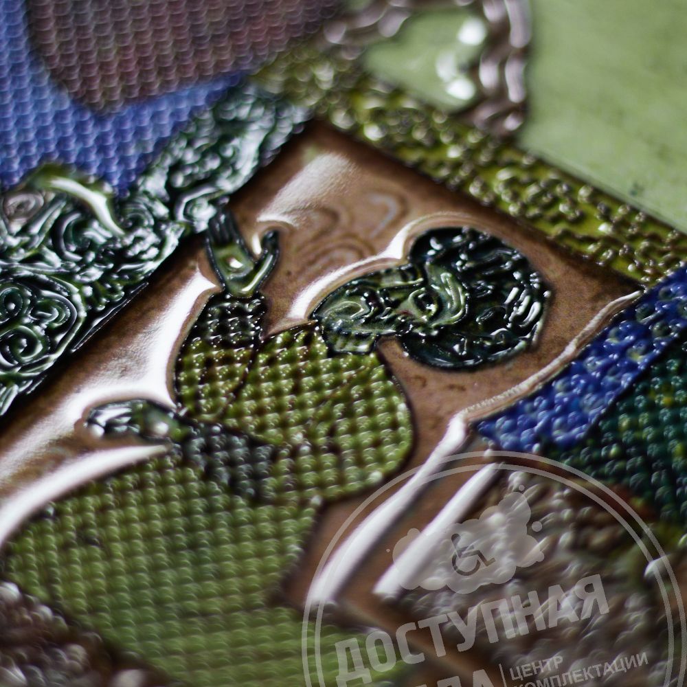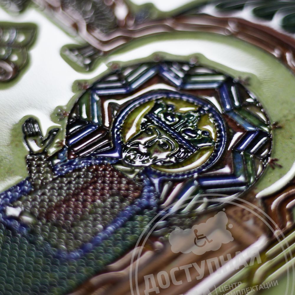 Тактильная поверхность представляет собой рельеф, состоящий из набора полимерных слоёв, где каждый последующий слой полимеризуется на поверхности предыдущего при помощи УФ излучения. Высота рельефно-точечного шрифта 0,6-0,7 мм, но не менее 0,5 мм по ГОСТ Р 51671-2020. На портрете возможно расположение тифлометок для передачи более полного описания репродукции, с учётом особенностей восприятия информации тотально слепыми людьми. Тактильная 2D картина идет в комплекте вместе с багетом.