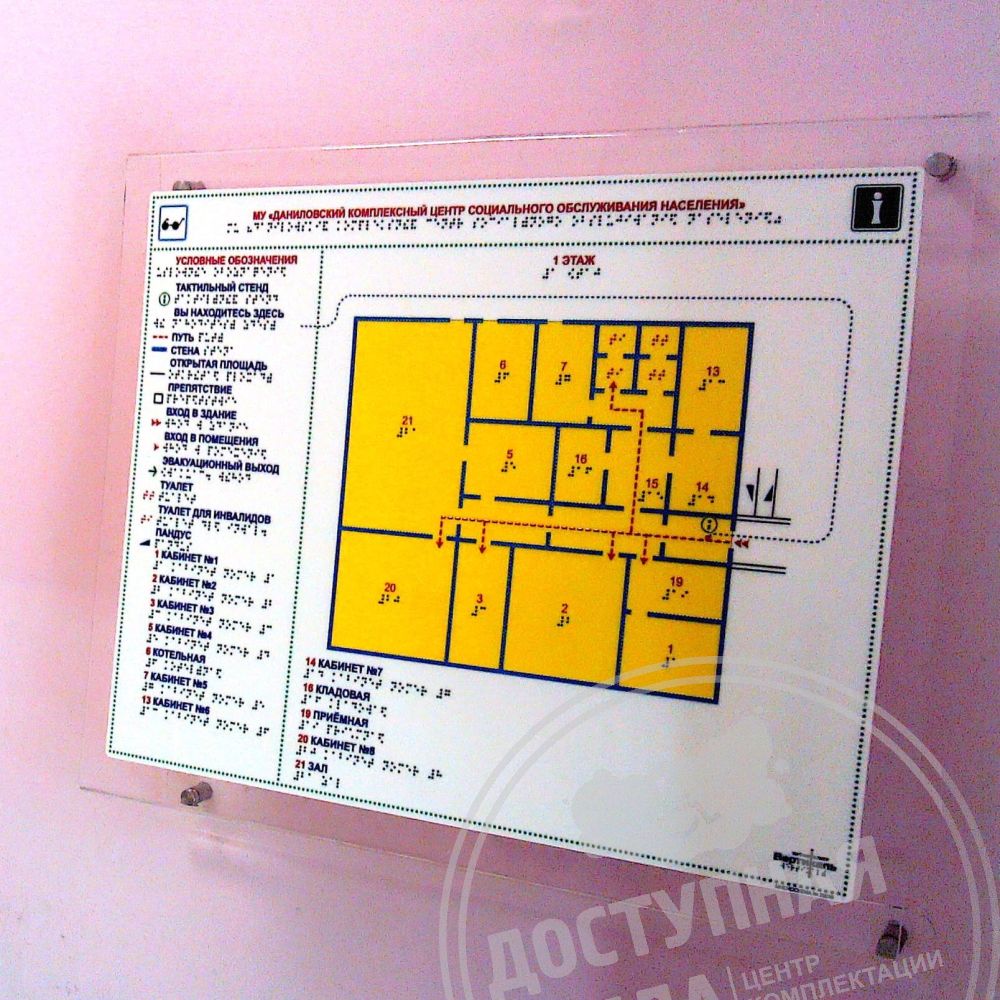 Изделие представляет собой устройство для настенного крепления тактильной мнемосхемы 150х300 мм, с целью её размещения в доступной зоне для людей с нарушением зрения. Для обеспечения продолжительного эксплуатационного периода и травмобезопасных условий, крепление изготовлено из цельнолитого прозрачного полимерного стекла, толщиной 5 мм, не имеющего клеевых соединений.Характеристики: