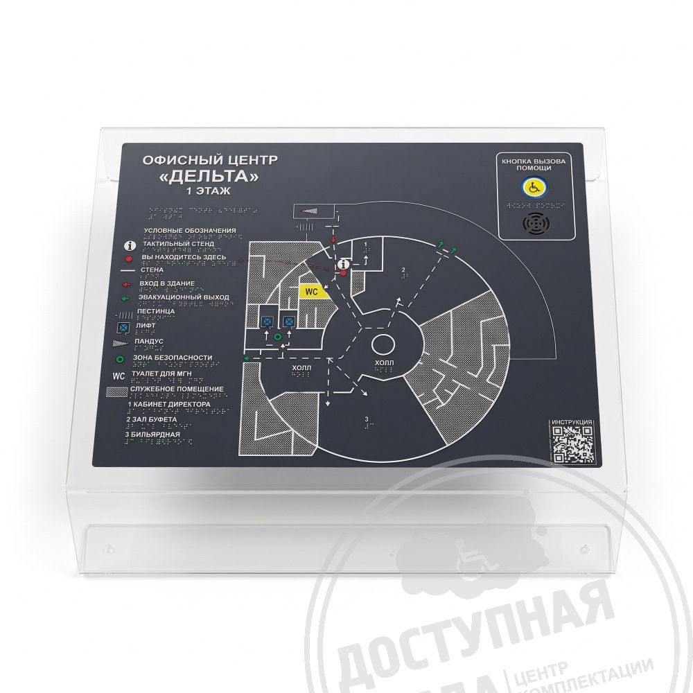 п. 6.5.12 СП 59.13330.2020 В зданиях с массовым пребыванием людей (пассажирские здания вокзалов всех видов транспорта, организации социального обслуживания, общественные здания административного назначения, многофункциональные комплексы и т.п.) для инвалидов по зрению следует устанавливать тактильные или тактильно-звуковые схемы, отображающие информацию о размещении и назначении помещений в здании. Они должны размещаться в вестибюле вблизи входа по возможности с правой стороны по ходу движения на расстоянии не более 4 м от входа в здание.