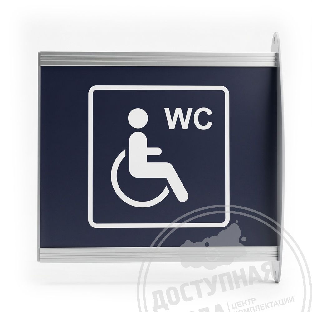 Флаговый настенный указатель с торцевым креплением определяет направление движения стрелкой и вместе с тем сигнализирует посетителям о том, что на данном объекте оборудован доступный туалет для людей с ограниченной мобильностью.