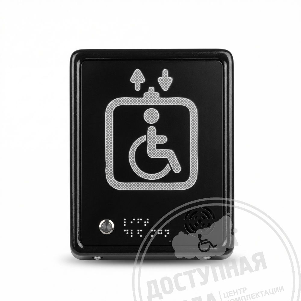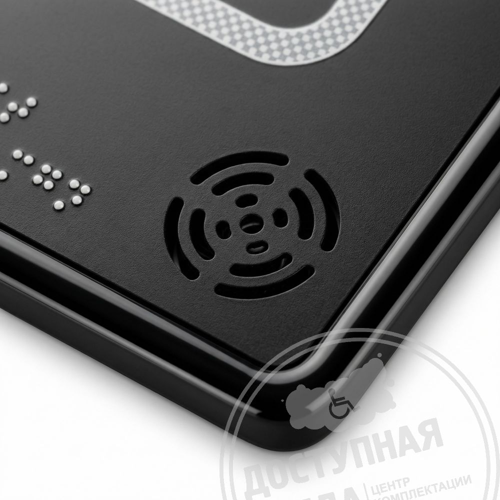 Тактильно-звуковая пиктограмма выполнена в корпусе из полистирола 2мм с табличкой из ABS пластика. Имеет тактильную зону (изображение), шрифт по системе Брайля и встроенный речевой информатор, на который можно записать любое сообщение. Благодаря своей эстетичной металлической форме, тактильная табличка отлично впишется даже в самый строгий офисный интерьер благодарю строгому сочетанию черного и белого цветов.
