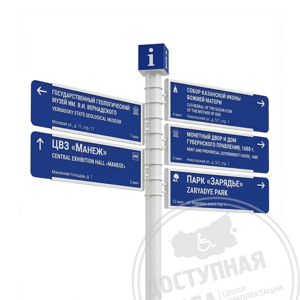 Городской указатель служит для навигации жителей и гостей, помогая быстро находить нужные объекты. Конструкция предусматривает поворотный механизм табличек, позволяющий легко обновлять информацию о направлениях без физического перемещения самого столба.
