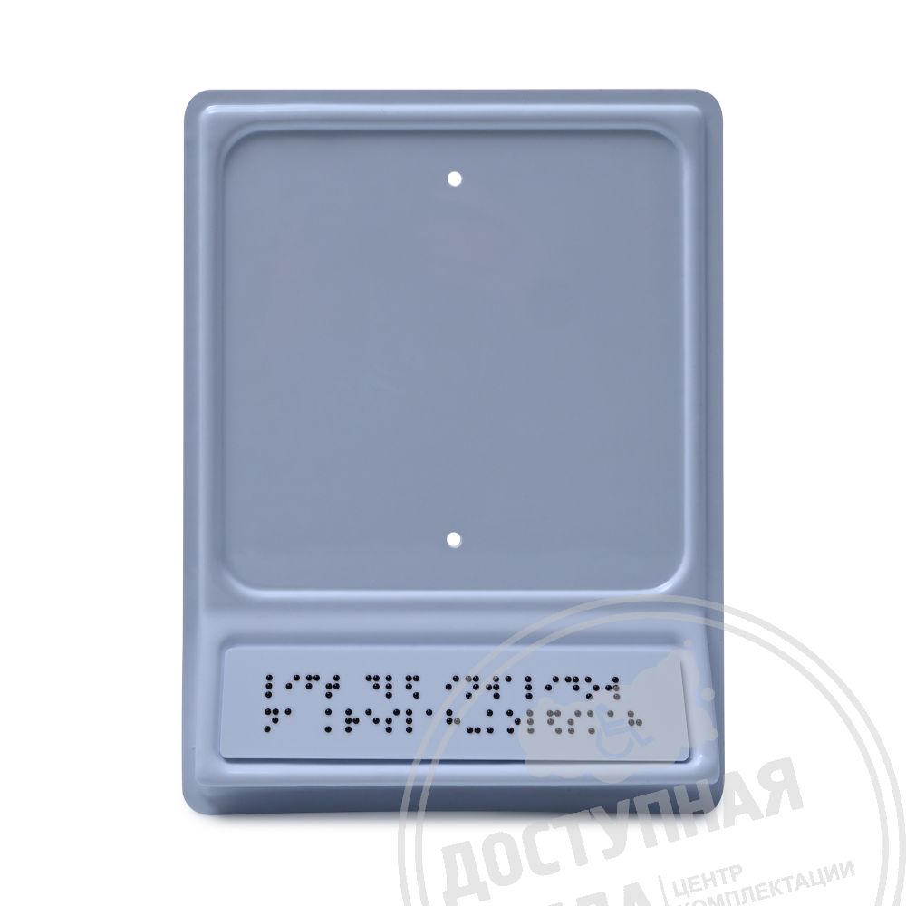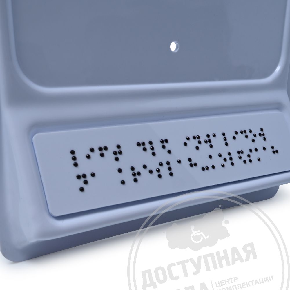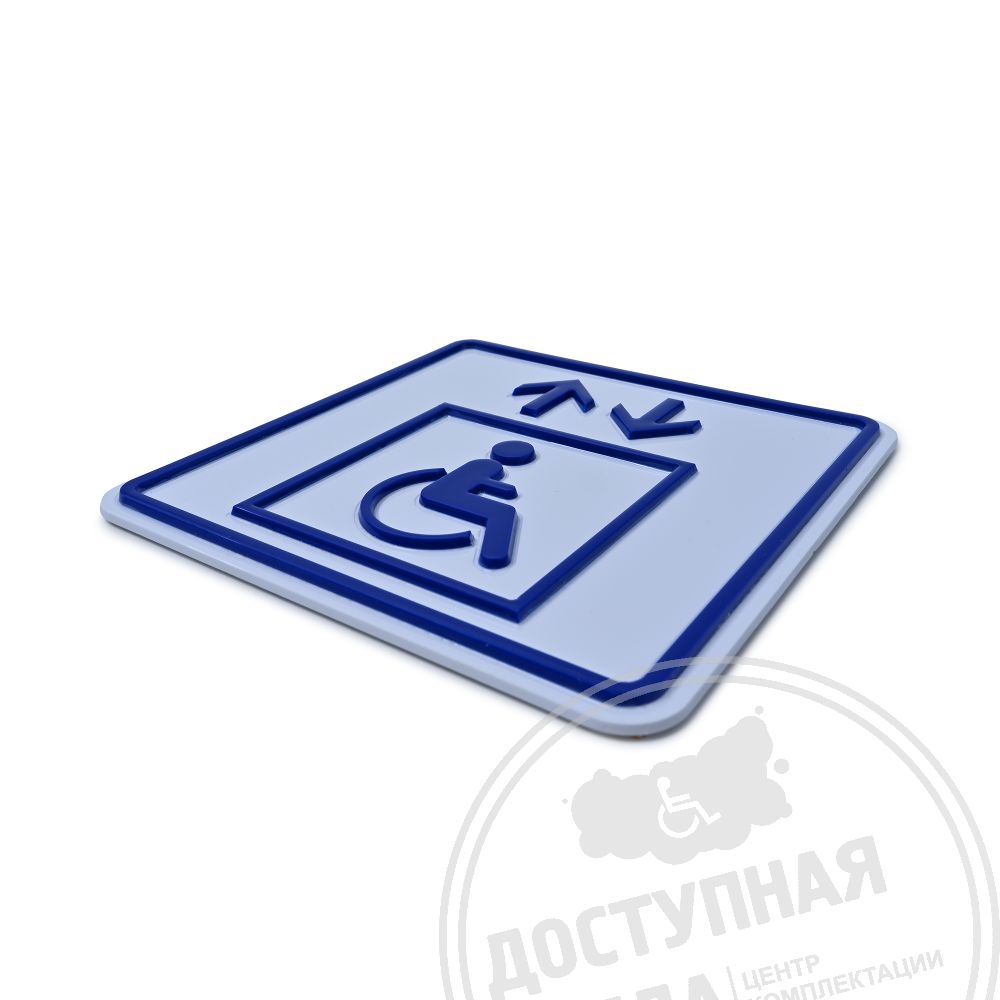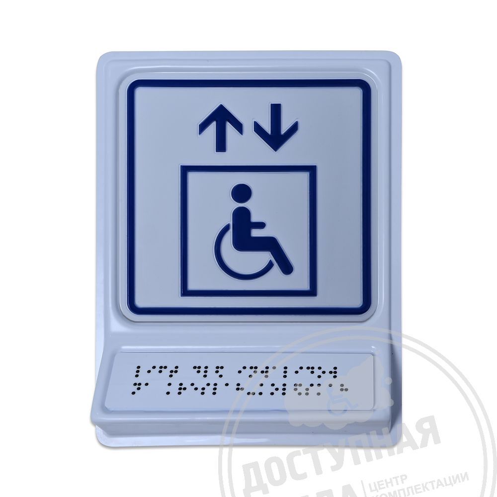Тактильный указатель обозначающий лифт для инвалидов на креслах-колясках. Обладает тактильным эффектом для восприятия незрячими и слабовидящими людьми. Информация продублирована по системе Брайля на специальной наклонной площадке, что позволяет считывать информацию незрячему человеку значительно быстрее.