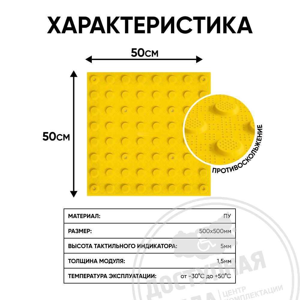 Плитка тактильная (преодолимое препятствие, поле внимания, конусы линейные) противоскользящая, 500х500х5, ПУ, желтый