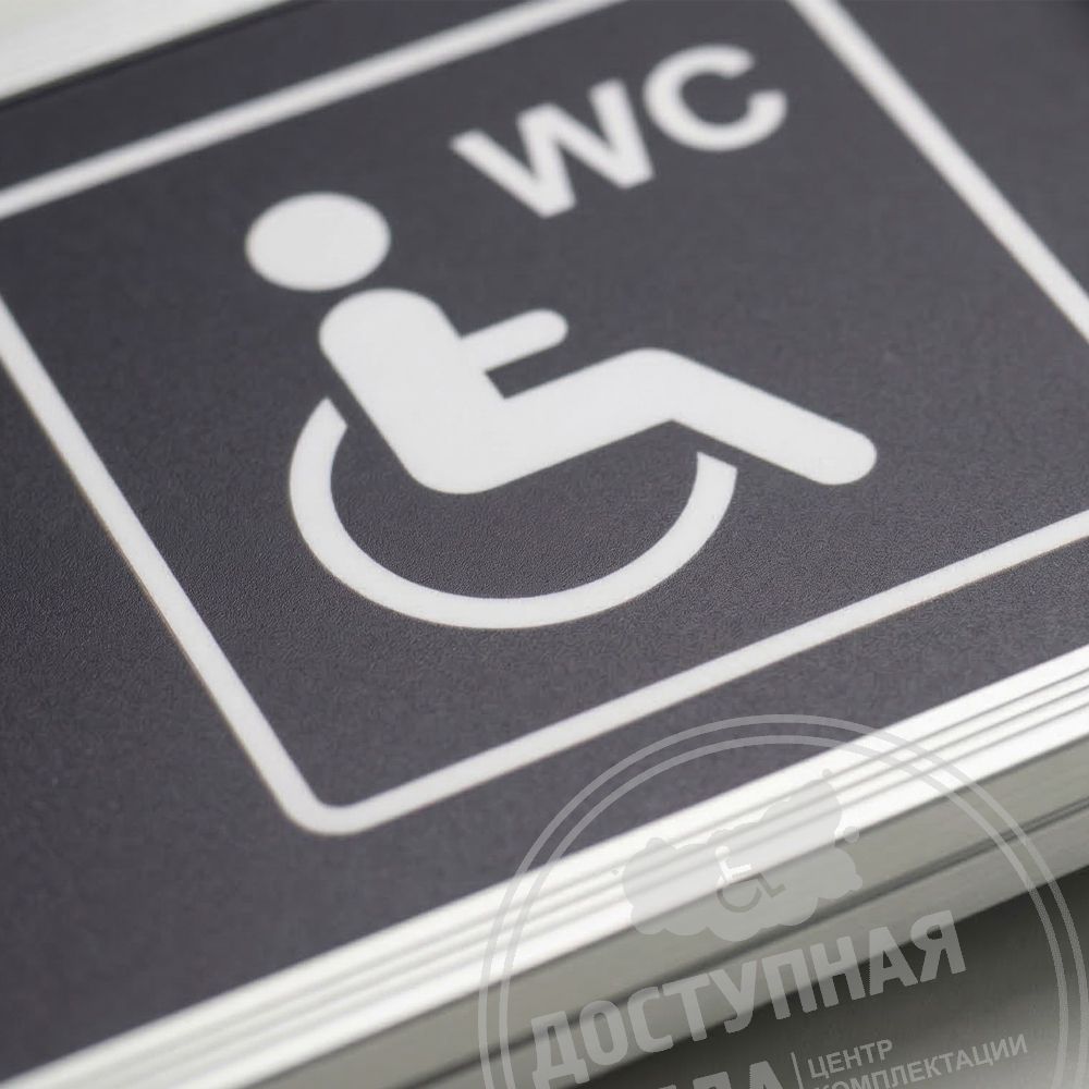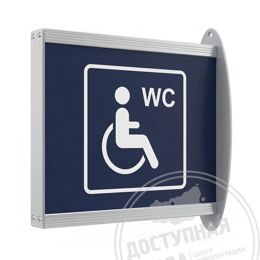 Флаговый настенный указатель с торцевым креплением определяет направление движения стрелкой и вместе с тем сигнализирует посетителям о том, что на данном объекте оборудован доступный туалет для людей с ограниченной мобильностью.