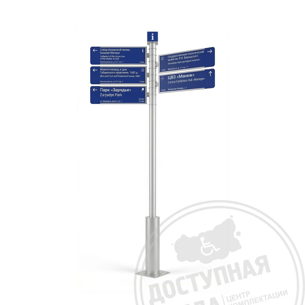 Городской указатель служит для навигации жителей и гостей, помогая быстро находить нужные объекты. Конструкция предусматривает поворотный механизм табличек, позволяющий легко обновлять информацию о направлениях без физического перемещения самого столба.