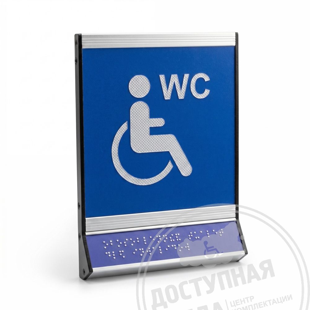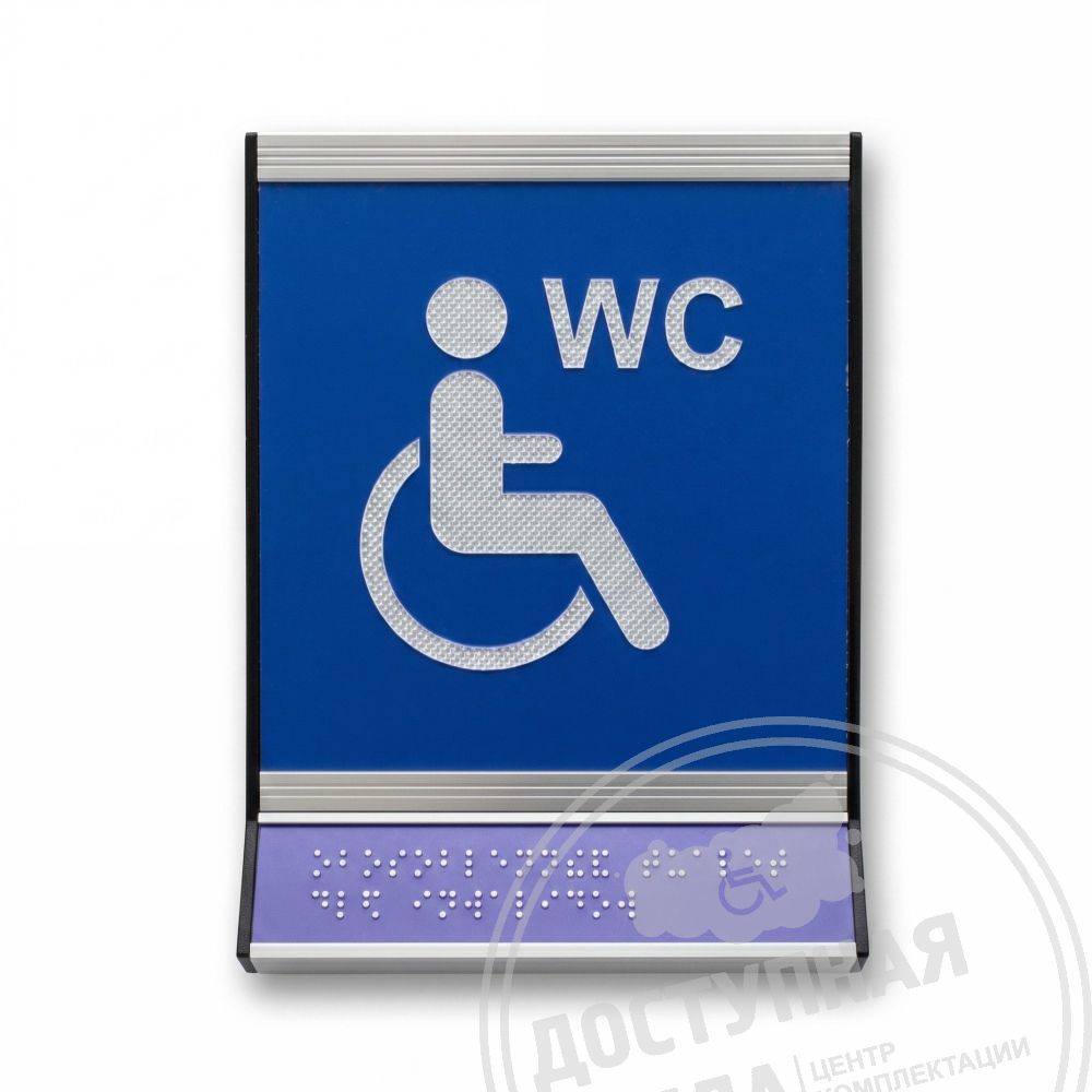 Пиктограмма тактильная, модульная "Обособленный туалет доступный для инвалидов на кресле-коляске", с наклонным синем полем, белым шрифтом, одинарная, М18