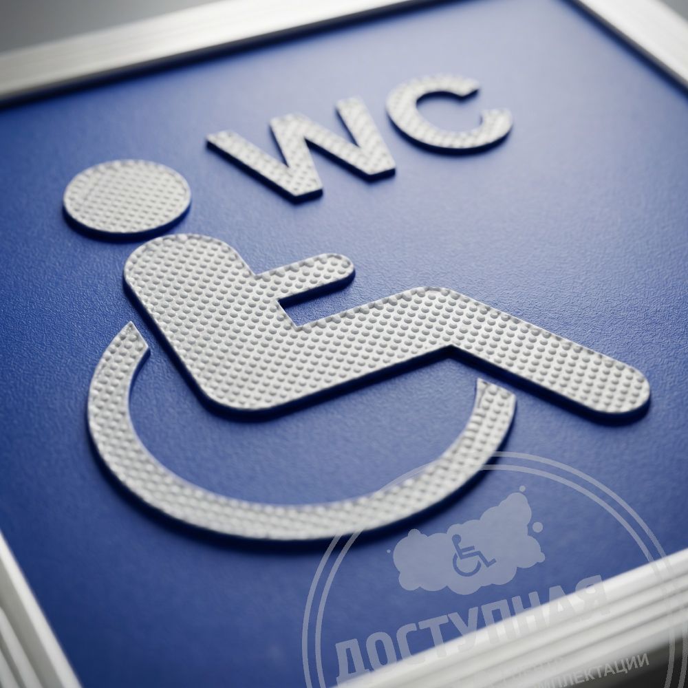Модульная тактильная пиктограмма доступности с символом инвалидного кресла четко обозначает наличие оборудованного туалета для колясочников. Указатель специально разработан для слабовидящих и незрячих людей.