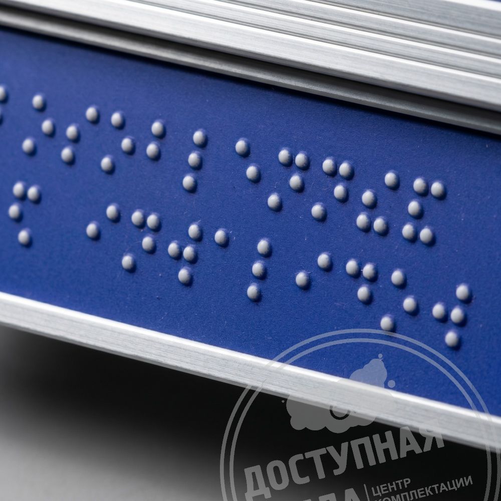 Изготовлена в прочной алюминиевой рамке с наклонным тактильным полем (soft-touch, угол 15°) и рельефно-точечным шрифтом Брайля для названия. Доступна визуально и на ощупь — подходит всем, независимо от навыков чтения Брайля.
